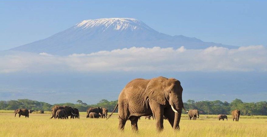 Classic Amboseli scenery—elephants framed by Mount Kilimanjaro