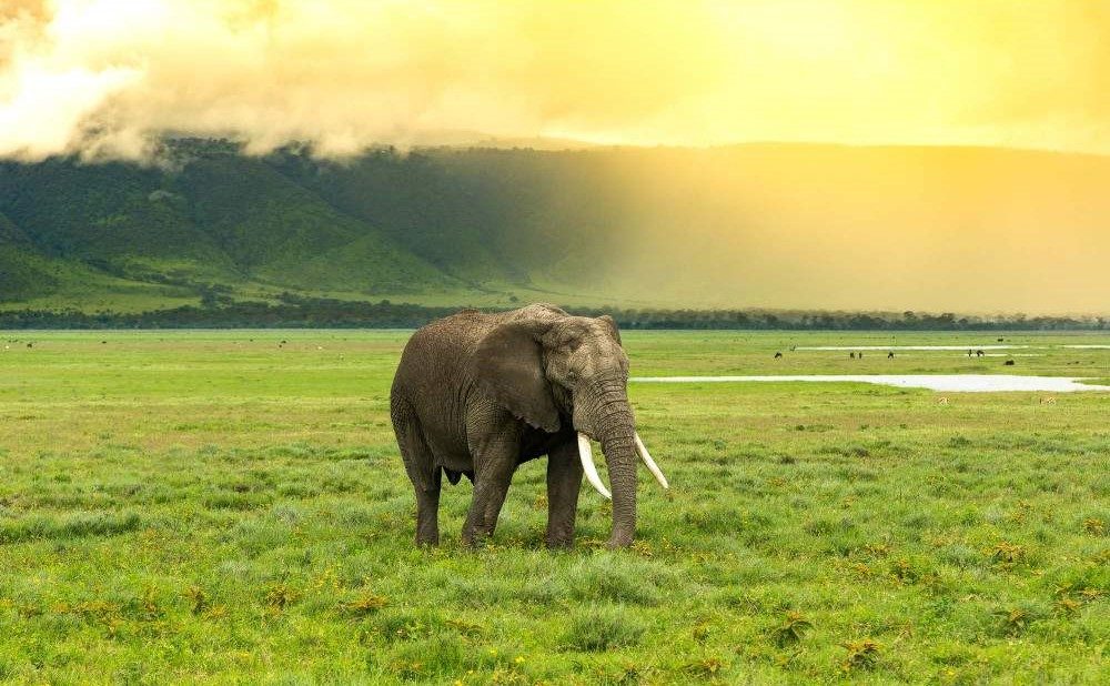 Elephants, lions, buffalo, giraffes, and plains game move across golden grasslands as the sun begins to soften.